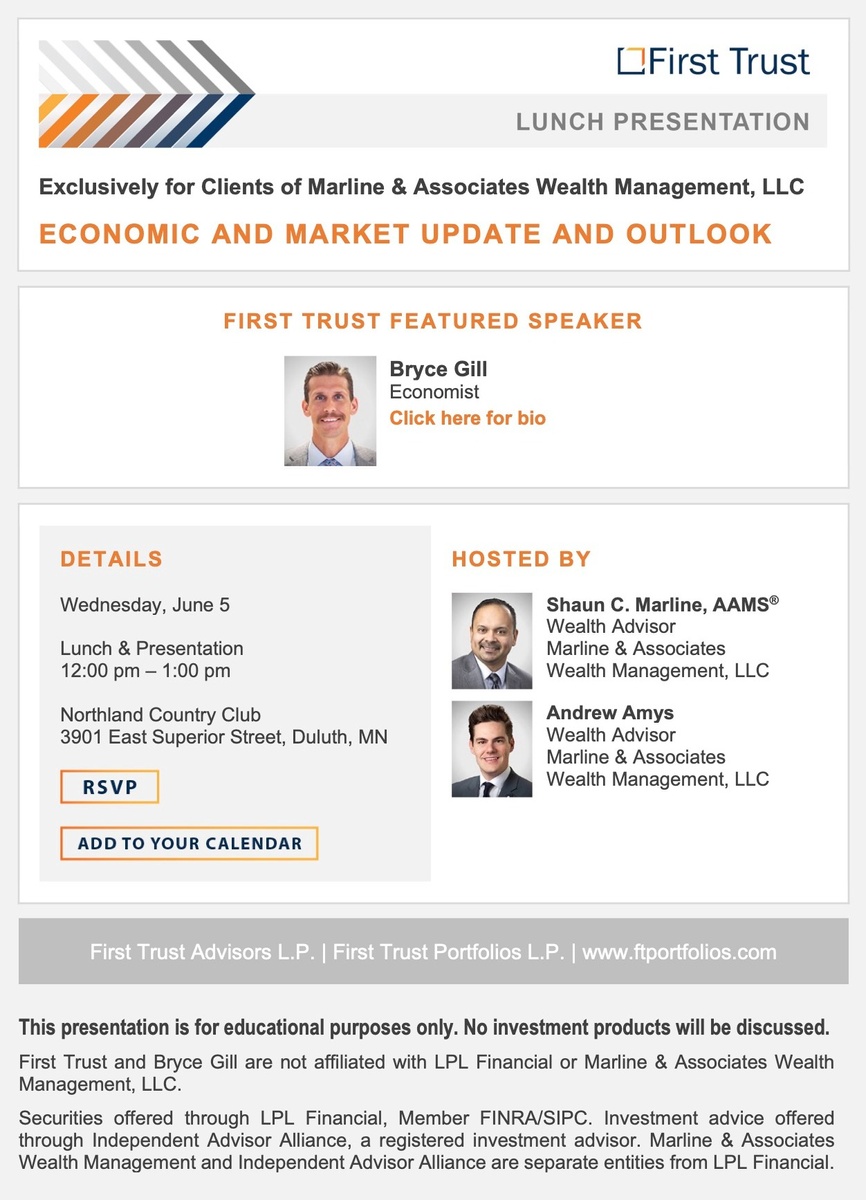 Now is a great time to review the year's market behavior and talk about what may lay ahead. This presentation event examines the financial factors at play, including economic developments, world events, and other market influences. It also looks at what might be around the corner for 2024 in addition to answering any questions you may have.Exclusively for Clients of Marline & Associates Wealth Management, LLC.